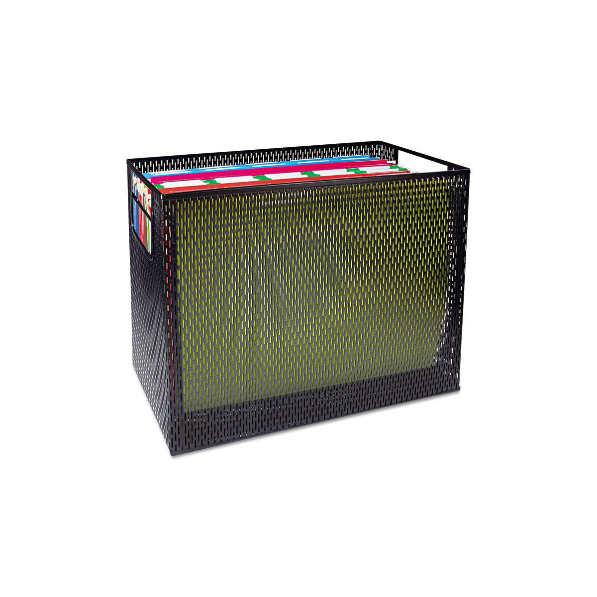 Strong, professional grade punched metal with decorative urban style slotted pattern. High quality satin finish complements any décor. Features protective feet to prevent surface wear and scratches on the desktop surface. Reinforced rounded edges provide durability and attractive detailing. Provides desktop access to standard letter size hanging file folders, keeping important documents organized and easily accessible. Side handles make the desktop file to transport.