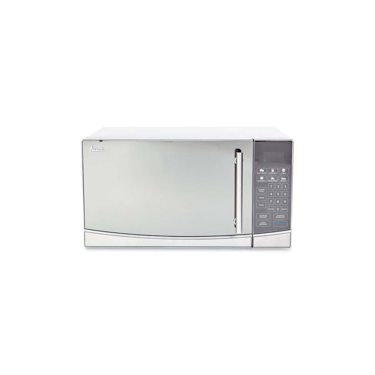 Save counter space with this compact, 1.1 cubic foot, stainless steel microwave oven with mirrored door from Avanti. The perfect countertop microwave for the dorm, man cave, office, studio apartment, RV, tiny home, rental room, condo, vacation home, or anywhere you need to cook food fast. This small microwave features 1,000 watts of cooking power, an electronic control panel, six pre-set cooking settings (baked potato, popcorn, pizza, beverage, frozen dinner, reheat), and a removable, glass turntable all in its compact footprint that fits perfectly on the countertop.