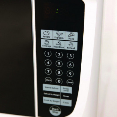 This microwave has 1.4 cubic foot capacity and 1,000 watts of cooking power. Other features include an electronic control panel, one-touch cooking programs, speed defrost and cook/defrost by weight.