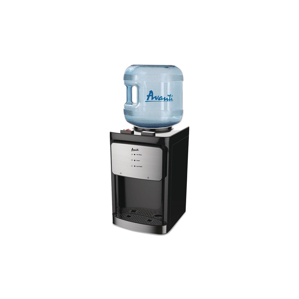 Save time and money with a dual tap, countertop thermoelectric water cooler from Avanti. With a sleek stainless steel finish, this is the perfect compact water cooler for the office, kitchen, worksite, warehouse, gym, or anywhere you want to add access to water. Enjoy instant access to a refreshing glass of cold drinking water or easily prepare your favorite hot beverage, soup, or oatmeal from the dual faucet dispenser. This top-loading water dispenser accommodates three or five gallon water bottles, helping reduce waste from single-serve bottles.