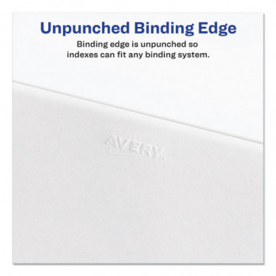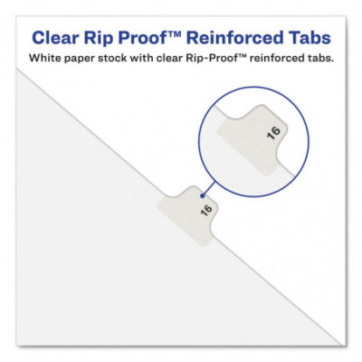 Use these dividers to organize index briefs, legal exhibits, mortgage documentation files and more. The crisp and clean white paper stock dividers give files a professional appearance. The durable Rip Proof™ reinforced tabs are preprinted on both sides so information can be located easily. The unpunched binding edges mean these indexes can fit practically any binding system.