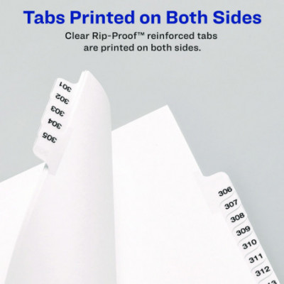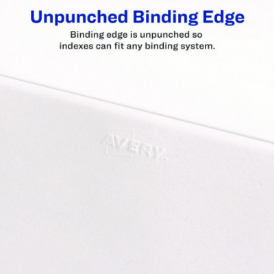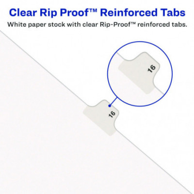 Rip Proof reinforced, dual-sided, laminated tabs make it easy to organize your information. The binding edge is unpunched, so these dividers can fit practically any binding system. Ideal for briefs, legal exhibits, mortgage documentation files and more! Avery® Style is Helvetica bold type style and Allstate® Style is Helvetica regular type style.