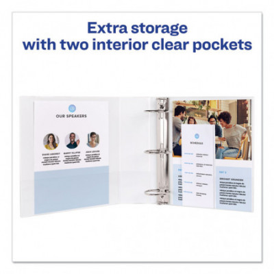 Perfect for light-use, this slim binder is a convenient and lightweight solution. Textured clear cover hides surface damage resulting from normal use. Put your personal stamp on the binder by designing a customized cover from Avery® Design & Print. Tuck important handouts, pamphlets and other loose or unpunched paperwork into the two interior pockets for quick access. Rings are either back-mounted for a clean spine and pages lie flat, or spine-mounted with concealed rivets - perfect for customizing front and back layers. It's the friend your papers never knew they were missing.