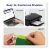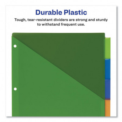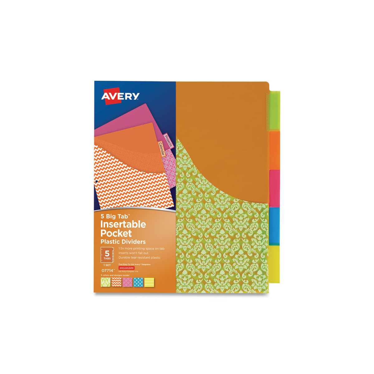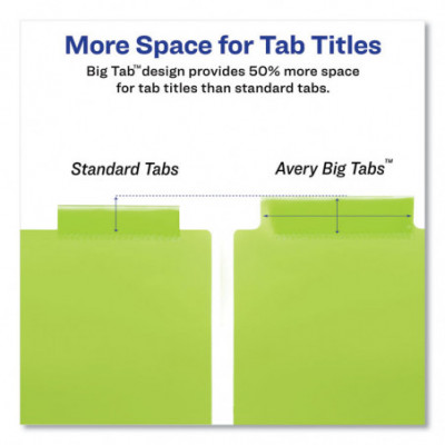 Big Tab™ dividers are bigger, providing 1.5 times more writing space than standard tabs. Special tab design secures inserts, making it easy to insert and remove tab titles. The plastic pocket holds up to 8.5" x 11" loose papers without folding or punching. Made of durable, tear-resistant plastic.
