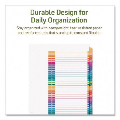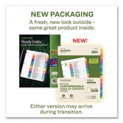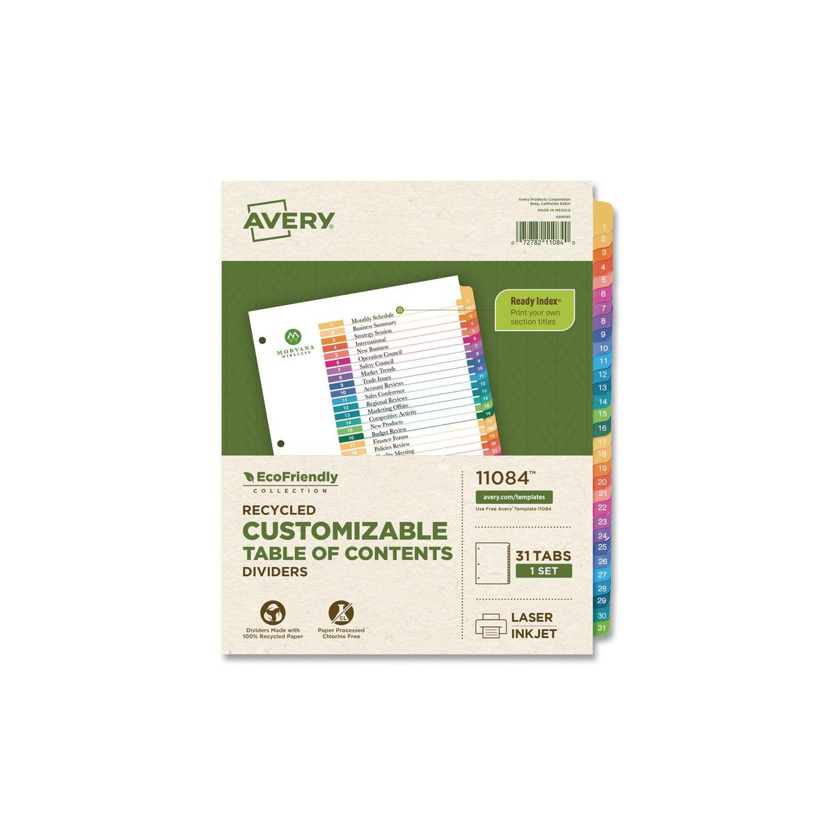 Organized documentation makes a business run like a well-oiled machine. These Ready Index Table of Contents Dividers help you stay organized so you can locate documents quickly and efficiently. They feature preprinted multicolor tabs that can be displayed in either landscape or portrait format. Using free templates from Avery Design & Print you can customize the included table of contents page and print in minutes. Organization and efficiency-makes life better for your business. For laser and inkjet printers.