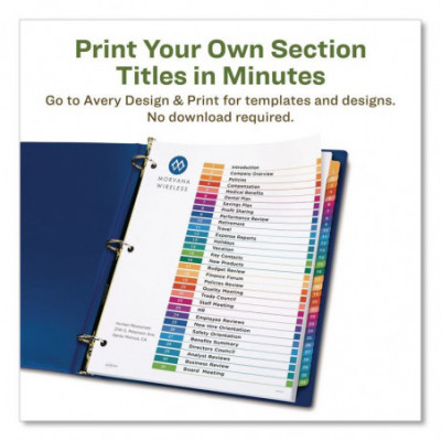 Organize documents quickly and easily without tab inserts or labels. Double-sided for use in portrait or landscape orientation. Heavyweight paper with double-sided reinforced holes and extended tab reinforcements. Easily customize the title page with free templates and designs from Avery Design & Print. For laser and inkjet printers.