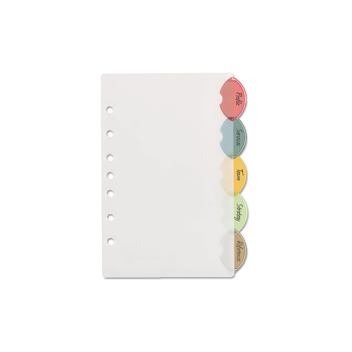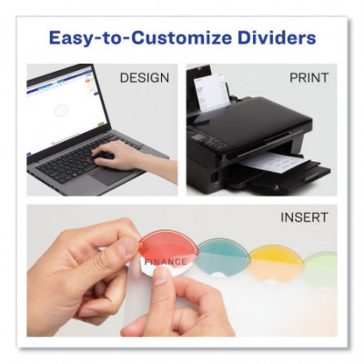 Durable translucent plastic offers style and convenience that lasts. Style Edge Insertable Plastic Dividers feature a distinctive tab design that makes for easy reference and also makes a statement. Customize the included specially designed inserts on your computer with free templates from Avery Design & Print. The unique tab design keeps your inserts from falling out. With these dividers, you're certain to achieve an organizational edge that's both colorful and attractive. For laser and inkjet printers.