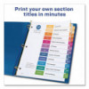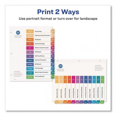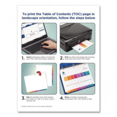 Organized documentation makes a business run like a well-oiled machine. These Ready Index Table of Contents Dividers help you stay organized so you can locate documents quickly and efficiently. They feature preprinted multicolor tabs that can be displayed in either landscape or portrait format. Using free templates from Avery Design & Print you can customize the included table of contents page and print in minutes. Organization and efficiency-makes life better for your business. For laser and inkjet printers.