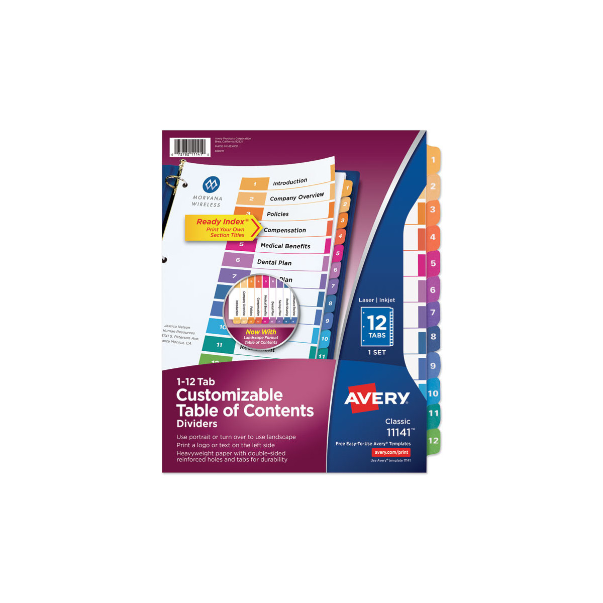 Organized documentation makes a business run like a well-oiled machine. These Ready Index Table of Contents Dividers help you stay organized so you can locate documents quickly and efficiently. They feature preprinted multicolor tabs that can be displayed in either landscape or portrait format. Using free templates from Avery Design & Print you can customize the included table of contents page and print in minutes. Organization and efficiency-makes life better for your business. For laser and inkjet printers.