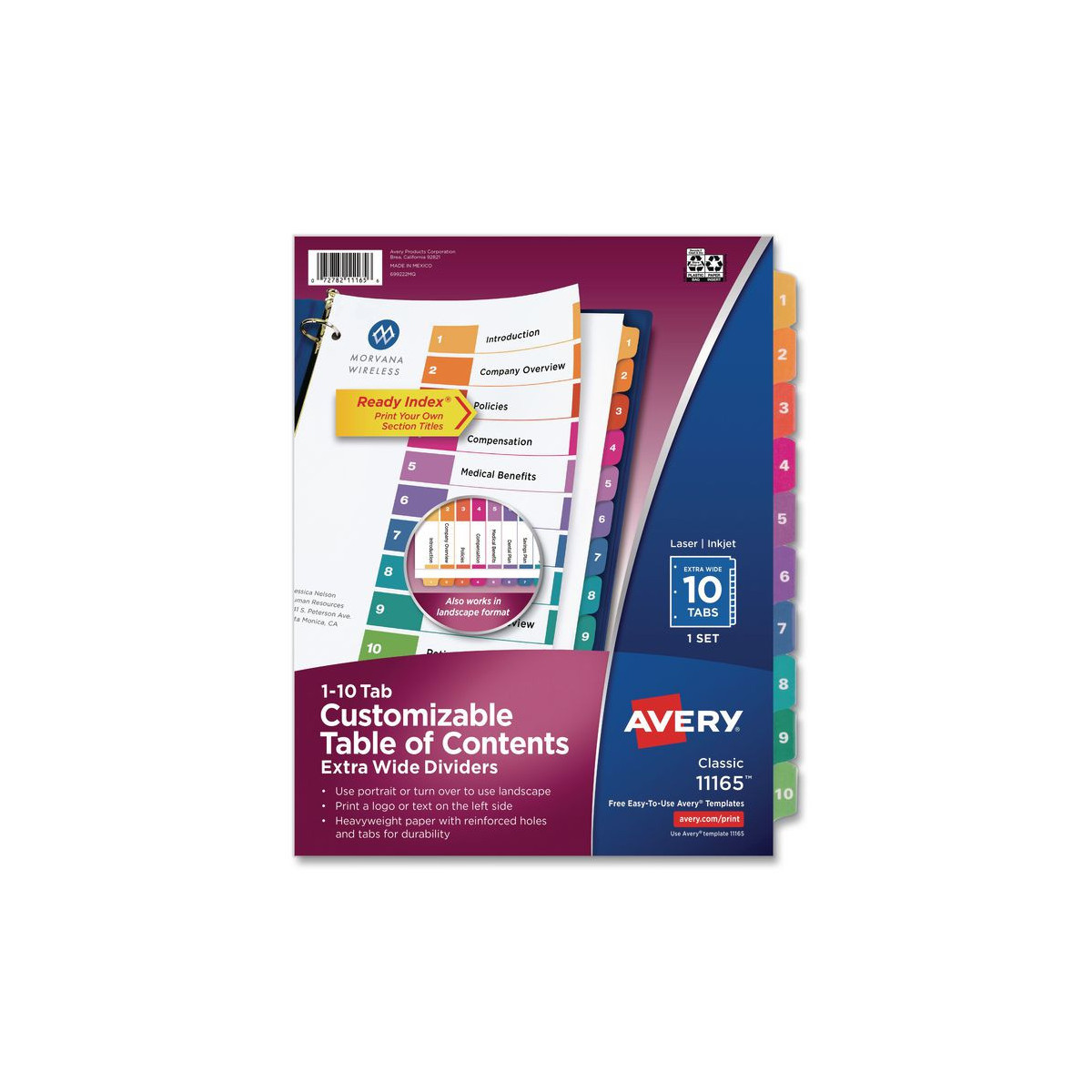Organized documentation makes a business run like a well-oiled machine. These Ready Index Table of Contents Dividers help you stay organized so you can locate documents quickly and efficiently. They feature preprinted multicolor tabs that can be displayed in either landscape or portrait format. Using free templates from Avery Design & Print you can customize the included table of contents page and print in minutes. Organization and efficiency-makes life better for your business. For laser and inkjet printers.