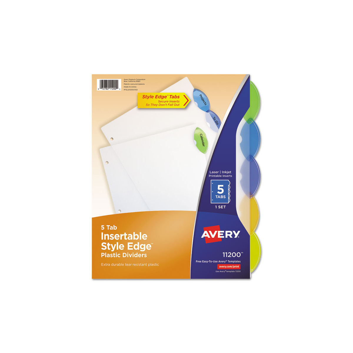 Durable translucent plastic offers style and convenience that lasts. Style Edge Insertable Plastic Dividers feature a distinctive tab design that makes for easy reference and also makes a statement. Customize the included specially designed inserts on your computer with free templates from Avery Design & Print. The unique tab design keeps your inserts from falling out. With these dividers, you're certain to achieve an organizational edge that's both colorful and attractive. For laser and inkjet printers.