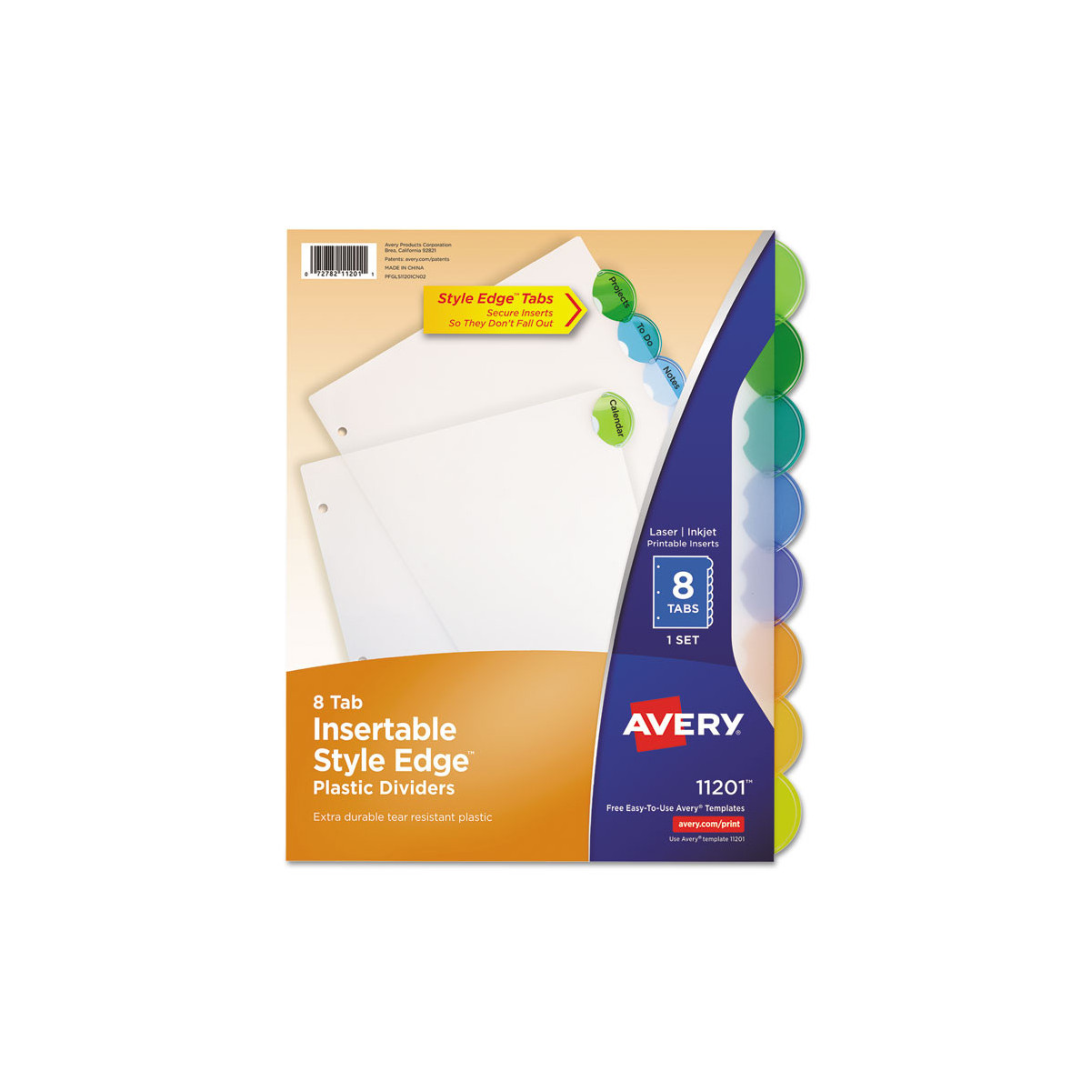 Durable translucent plastic offers style and convenience that lasts. Style Edge Insertable Plastic Dividers feature a distinctive tab design that makes for easy reference and also makes a statement. Customize the included specially designed inserts on your computer with free templates from Avery Design & Print. The unique tab design keeps your inserts from falling out. With these dividers, you're certain to achieve an organizational edge that's both colorful and attractive. For laser and inkjet printers.