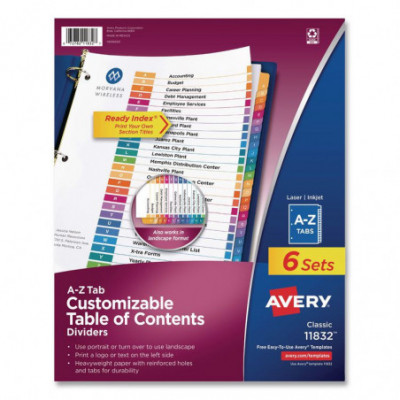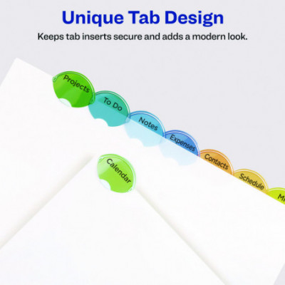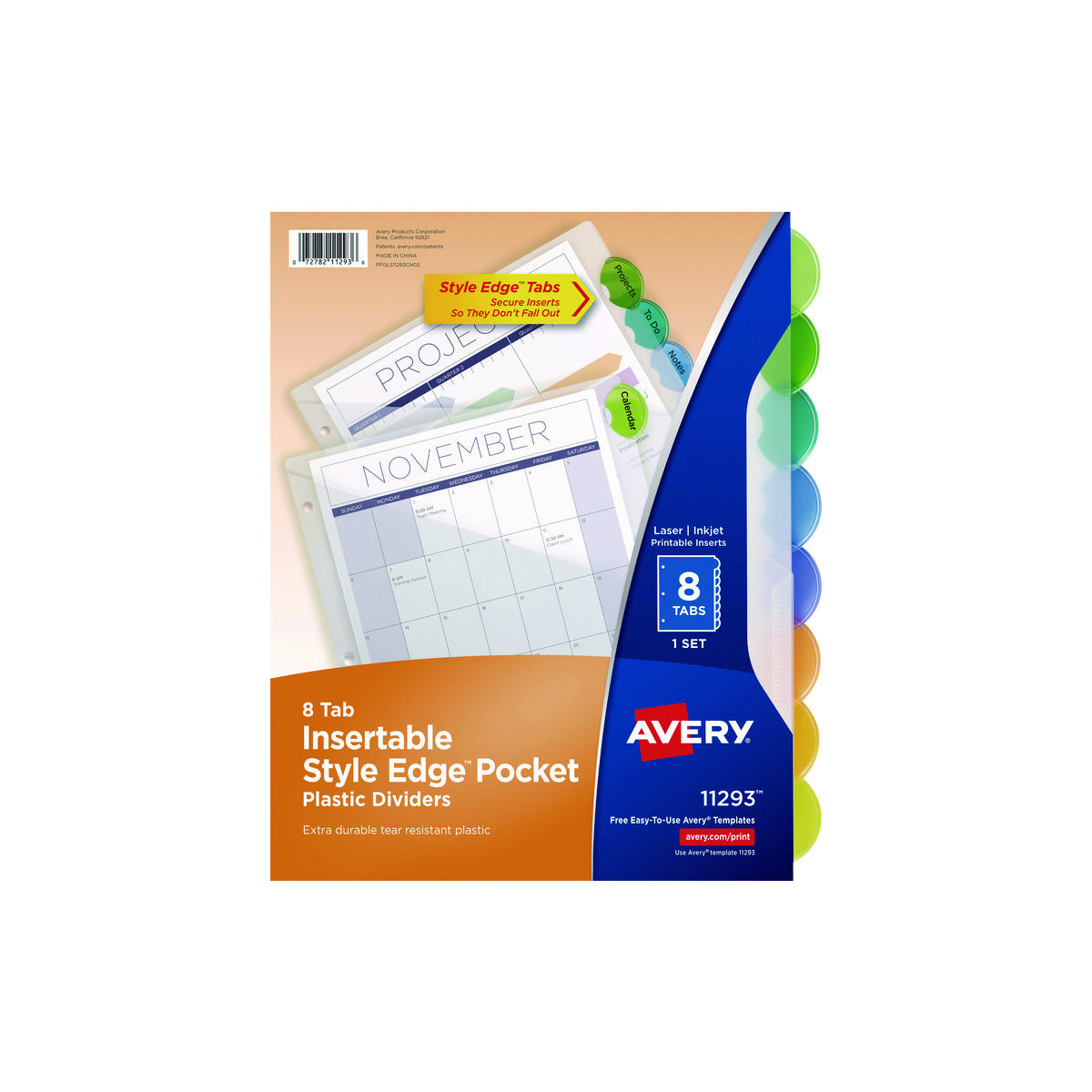 Durable translucent plastic offers style and convenience that lasts. Style Edge Insertable Plastic Dividers feature a distinctive tab design that makes for easy reference and also makes a statement. Customize the included specially designed inserts on your computer with free templates from Avery Design & Print. The unique tab design keeps your inserts from falling out. With these dividers, you're certain to achieve an organizational edge that's both colorful and attractive. For laser and inkjet printers.