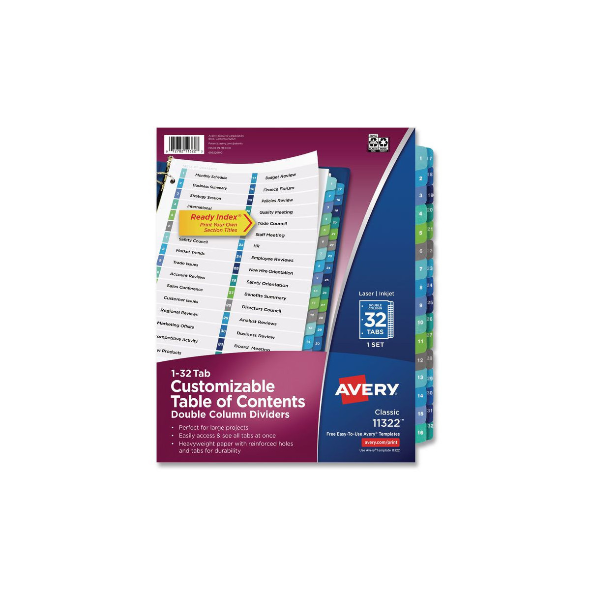 When you've got a big project, flex your organizational muscle with Double-Column Ready Index® Dividers. Designed to handle big projects easily and professionally, these multicolor tab dividers make it a snap to keep everything in order. The Table of Contents page features two columns so you have more space for your text, and it's easy to customize using the free quick-fill templates from Avery Design & Print. You'll get an innovative double-layer format that are easy to view and access. And because these dividers feature more durable paper, stronger tab reinforcement and double-sided hole reinforcement, you can rest assured they'll stand up to frequent use. Get a big boost in organizational power with the Double-Column Ready Index Dividers. For laser and inkjet printers.