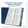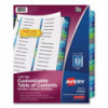 Table of Contents has two columns, providing more printing space to better identify each tab section. Double layer multicolor tabs have less overlap and are easier to grab and turn. Bottom set of tabs extend further out than top set to allow you to see all tabs at once. The coordinated system of a reinforced Table of Contents page and matching preprinted tab dividers makes referencing easy while delivering a professional look. Customize the Table of Contents page by adding section titles, as well as graphics or a company logo. Extended tab reinforcement and double-sided hole reinforcement on heavier weight paper prevents tearing, even with frequent use. Use in portrait or landscape formats. Easy to customize with free templates from Avery Design & Print. For laser and inkjet printers.