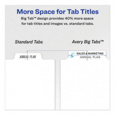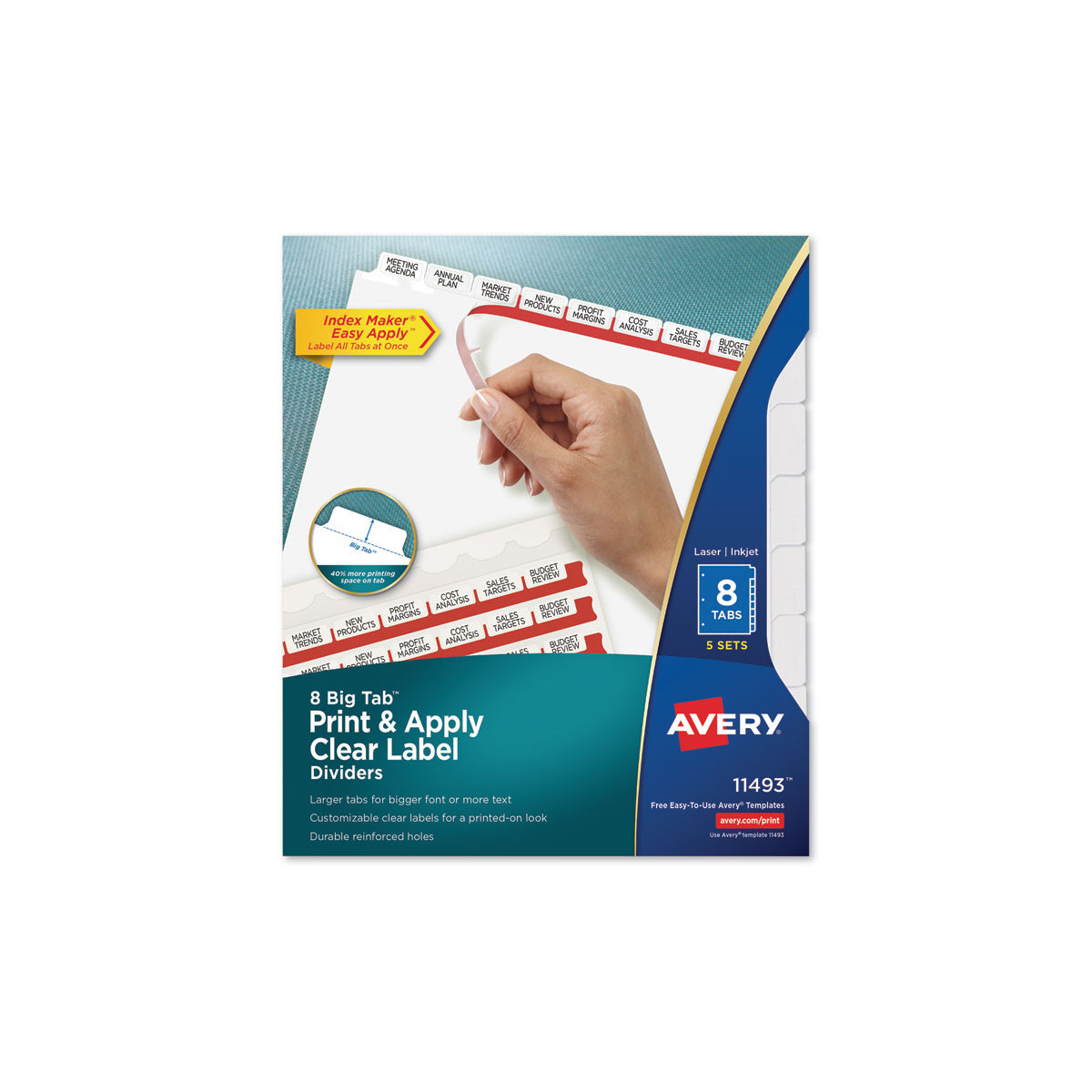 Whether you're organizing a single project or creating multiple sets, Index Maker® clear labels virtually disappear on divider tabs to give you a professional printed-on look. The Easy Apply label strip lets you label all tabs at once. Easy to customize with free templates from Avery Design & Print. Big Tab and Extra Wide selections offer greater convenience in office-wide references. Standard and mini size selections provide streamlined indexing in standard binders, planners and small personal binders. For laser and inkjet printers.