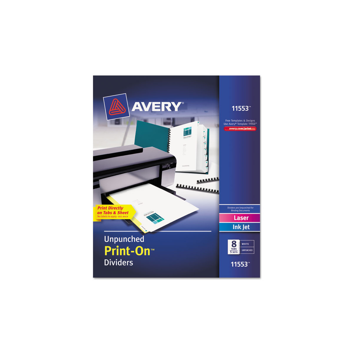 Print professional-looking dividers for presentations from your computer. Print logo, text and graphics directly on tabs and divider sheet. Print in either landscape or portrait format. Easy to customize with free templates from Avery® Design & Print. For laser, color laser and inkjet printers.