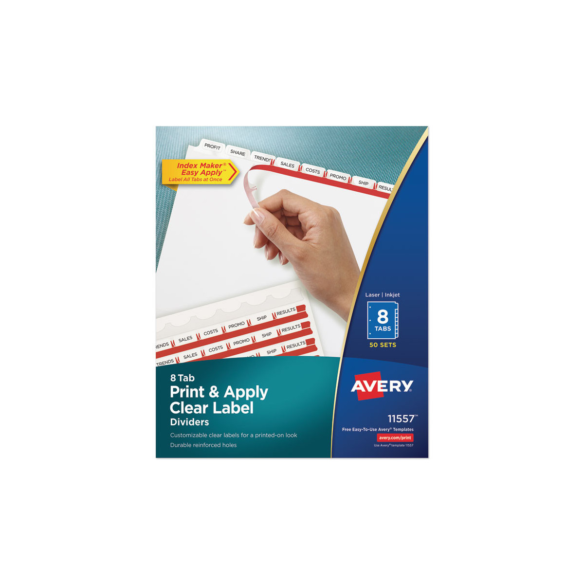 Whether you're organizing a single project or creating multiple sets, Index Maker® clear labels virtually disappear on divider tabs to give you a professional printed-on look. The Easy Apply label strip lets you label all tabs at once. Easy to customize with free templates from Avery Design & Print. Big Tab and Extra Wide selections offer greater convenience in office-wide references. Standard and mini size selections provide streamlined indexing in standard binders, planners and small personal binders. For laser and inkjet printers.
