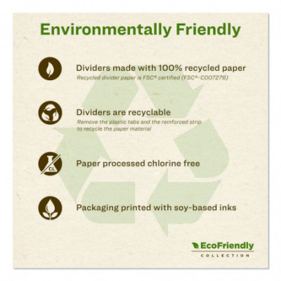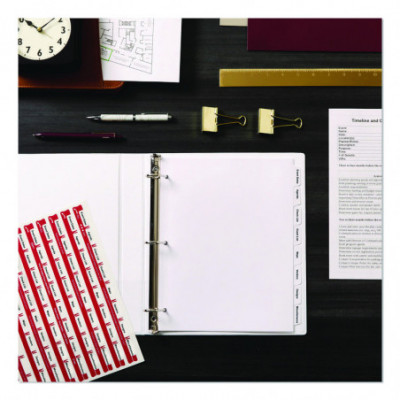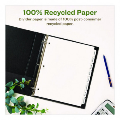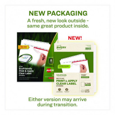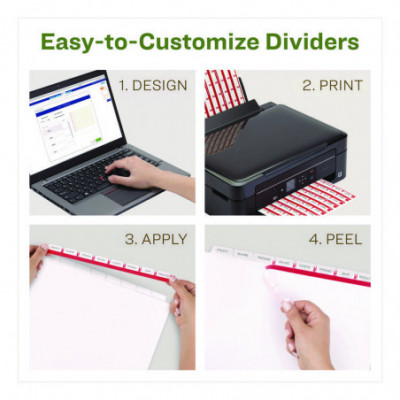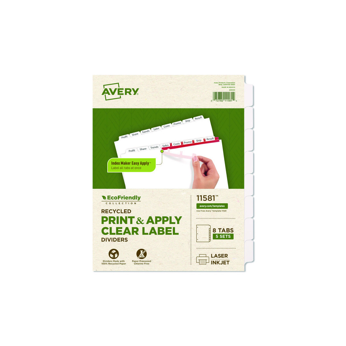 Dividers are made of post-consumer recycled materials and are processed chlorine-free. Clear labels virtually disappear when applied to tabs. Label all tabs at once using the Index Maker® Easy Apply label strip. Easy to customize with free templates from Avery Design & Print. For laser and inkjet printers.