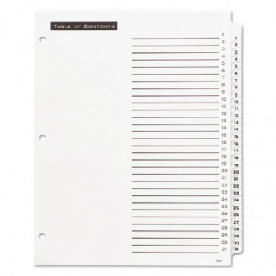Quick to organize, quick to reference. Economical white dividers for a variety of binder organization needs. Just print section titles on Table of Contents page that is color-coded to match pre-printed tabs. For use in standard three-ring binders.