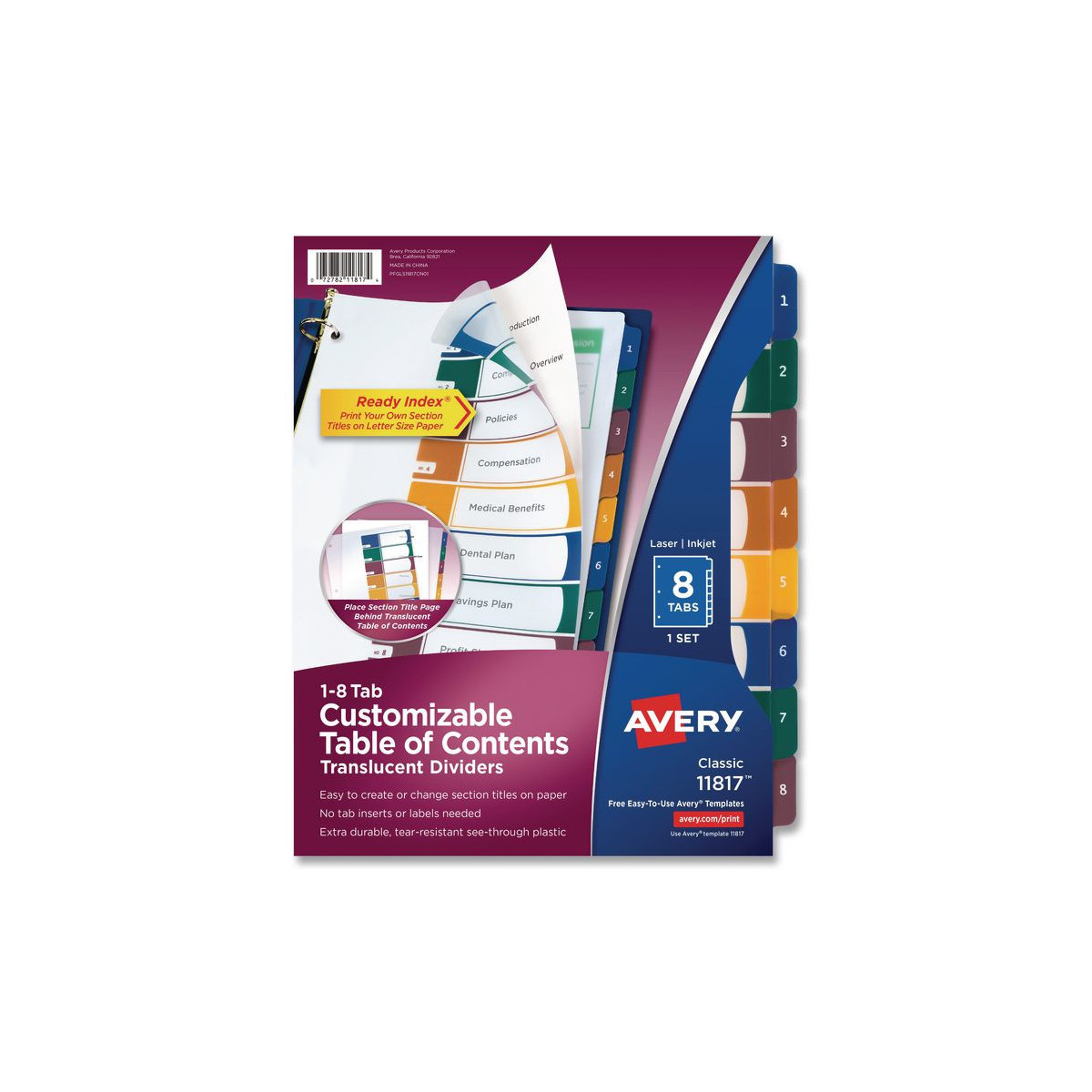 A well-organized presentation can really drive your message home. These Ready Index® Translucent Table of Contents Dividers will help you create an organized, attention-grabbing presentation in just minutes. They feature preprinted numbered multicolor tabs and contemporary-looking, translucent plastic pages for an attractive look and extra durability. Using free templates from Avery Design & Print you can customize your table of contents and then print it in minutes. Because when it comes to being professional, you're in the driver's seat. For laser and inkjet printers.