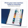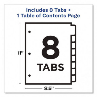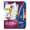 These durable plastic Table of Contents dividers with multicolor tabs offer a modern look. Print section titles onto a plain sheet of 8 1/2" x 11" paper, three-hole punch, and place behind the Table of Contents sheet. Contents sheet won't lift print. The coordinated system of a Table of Contents page and preprinted tab dividers makes referencing easy while delivering a professional look. Customize the Table of Contents page by adding section titles, as well as graphics or a company logo. Easy to customize with free templates from Avery Design & Print. For laser and inkjet printers.