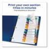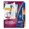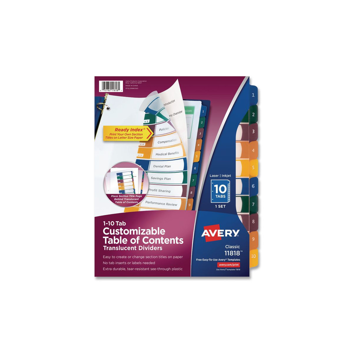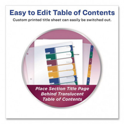These durable plastic Table of Contents dividers with multicolor tabs offer a modern look. Print section titles onto a plain sheet of 8 1/2" x 11" paper, three-hole punch, and place behind the Table of Contents sheet. Contents sheet won't lift print. The coordinated system of a Table of Contents page and preprinted tab dividers makes referencing easy while delivering a professional look. Customize the Table of Contents page by adding section titles, as well as graphics or a company logo. Easy to customize with free templates from Avery Design & Print. For laser and inkjet printers.
