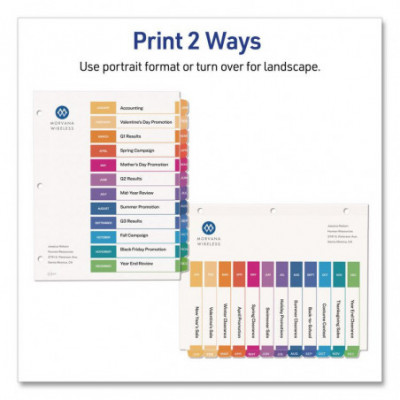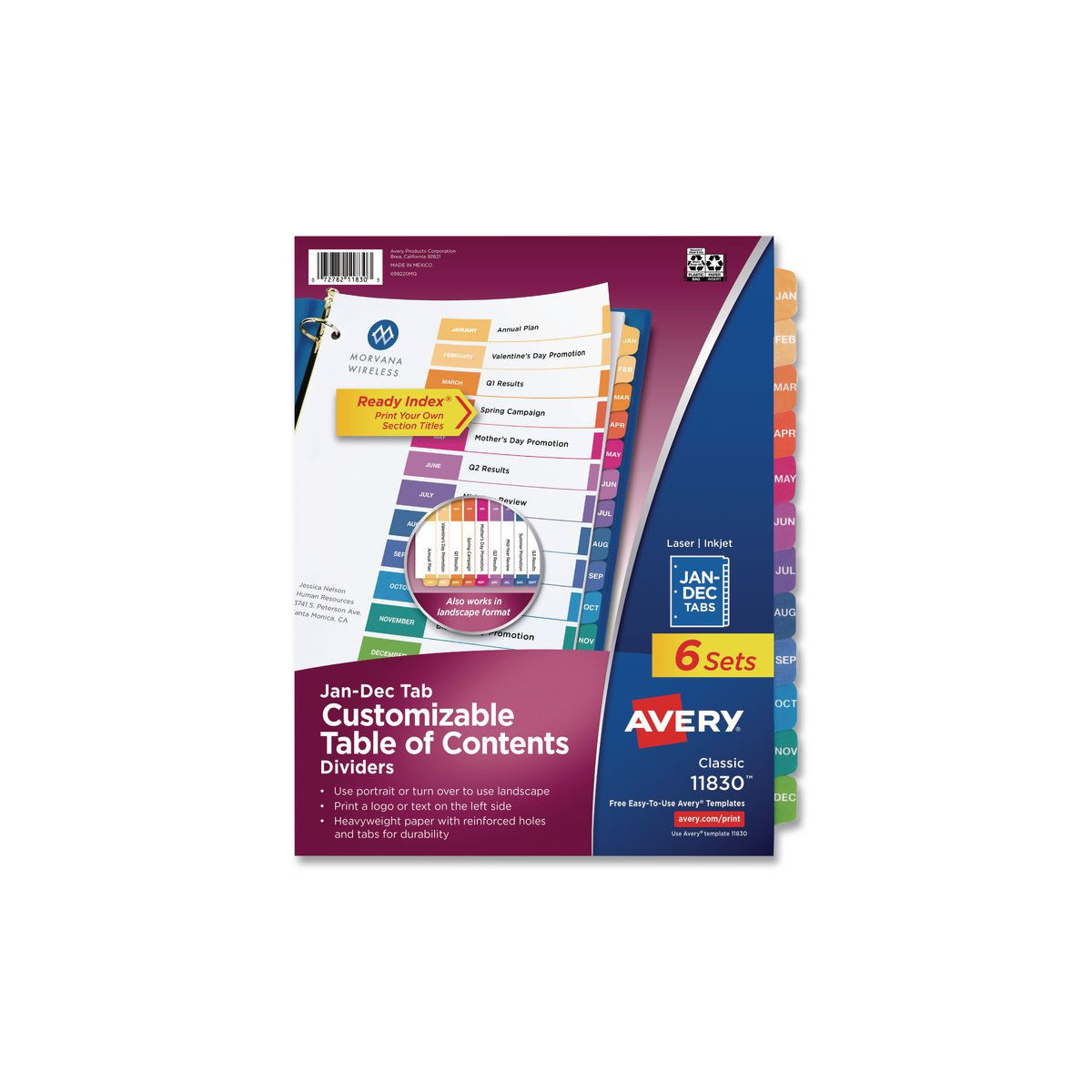 Organized documentation makes a business run like a well-oiled machine. These Ready Index Table of Contents Dividers help you stay organized so you can locate documents quickly and efficiently. They feature preprinted multicolor tabs that can be displayed in either landscape or portrait format. Using free templates from Avery Design & Print you can customize the included table of contents page and print in minutes. Organization and efficiency-makes life better for your business. For laser and inkjet printers.