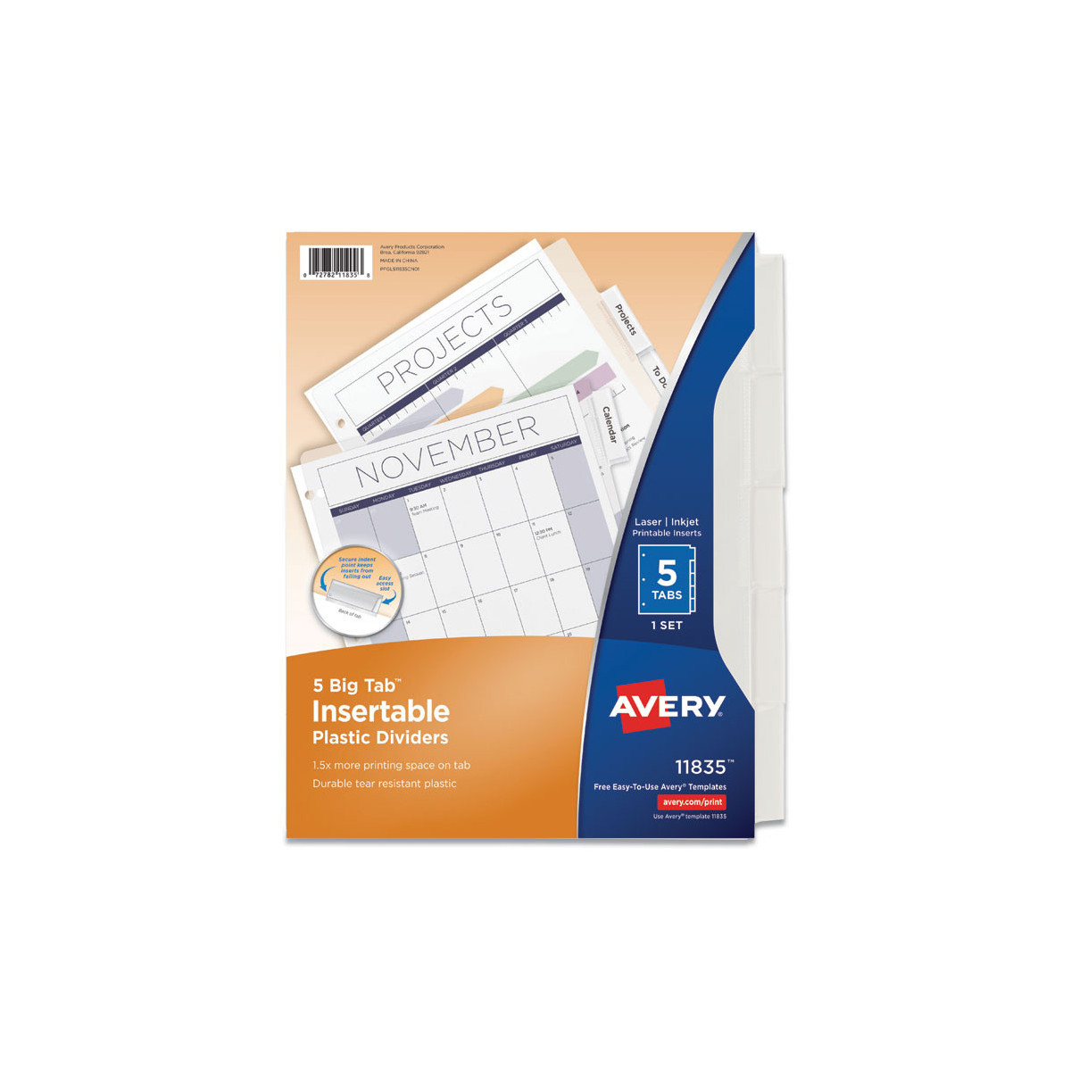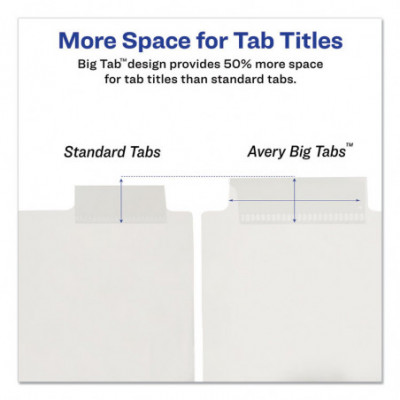 Sometimes good things do come in big packages. Big Tab™ Insertable Plastic Dividers offer extra convenience for your binder or notebook. The larger style insertable tabs accommodate inserts that you can print with sizeable fonts or more lines of text than on a typical insert for even more eye-catching power. Use free templates from Avery Design & Print to create professional-looking tabs. An easy-access notch at the top of the tab lets you slide inserts in and out with ease, while a secure indent point at the base of the tab keeps your insert from falling out. Translucent plastic offers a durable solution, so you can enjoy long-lasting organization of all your big ideas. Handwrite or print inserts on laser and inkjet printers.