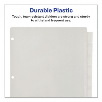Sometimes good things do come in big packages. Big Tab™ Insertable Plastic Dividers offer extra convenience for your binder or notebook. The larger style insertable tabs accommodate inserts that you can print with sizeable fonts or more lines of text than on a typical insert for even more eye-catching power. Use free templates from Avery Design & Print to create professional-looking tabs. An easy-access notch at the top of the tab lets you slide inserts in and out with ease, while a secure indent point at the base of the tab keeps your insert from falling out. Translucent plastic offers a durable solution, so you can enjoy long-lasting organization of all your big ideas. Handwrite or print inserts on laser and inkjet printers.