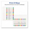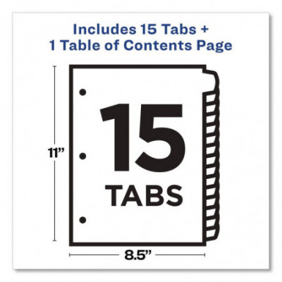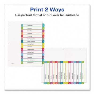 Organized documentation makes a business run like a well-oiled machine. These Ready Index Table of Contents Dividers help you stay organized so you can locate documents quickly and efficiently. They feature preprinted multicolor tabs that can be displayed in either landscape or portrait format. Using free templates from Avery Design & Print you can customize the included table of contents page and print in minutes. Organization and efficiency-makes life better for your business. For laser and inkjet printers.
