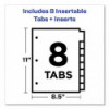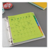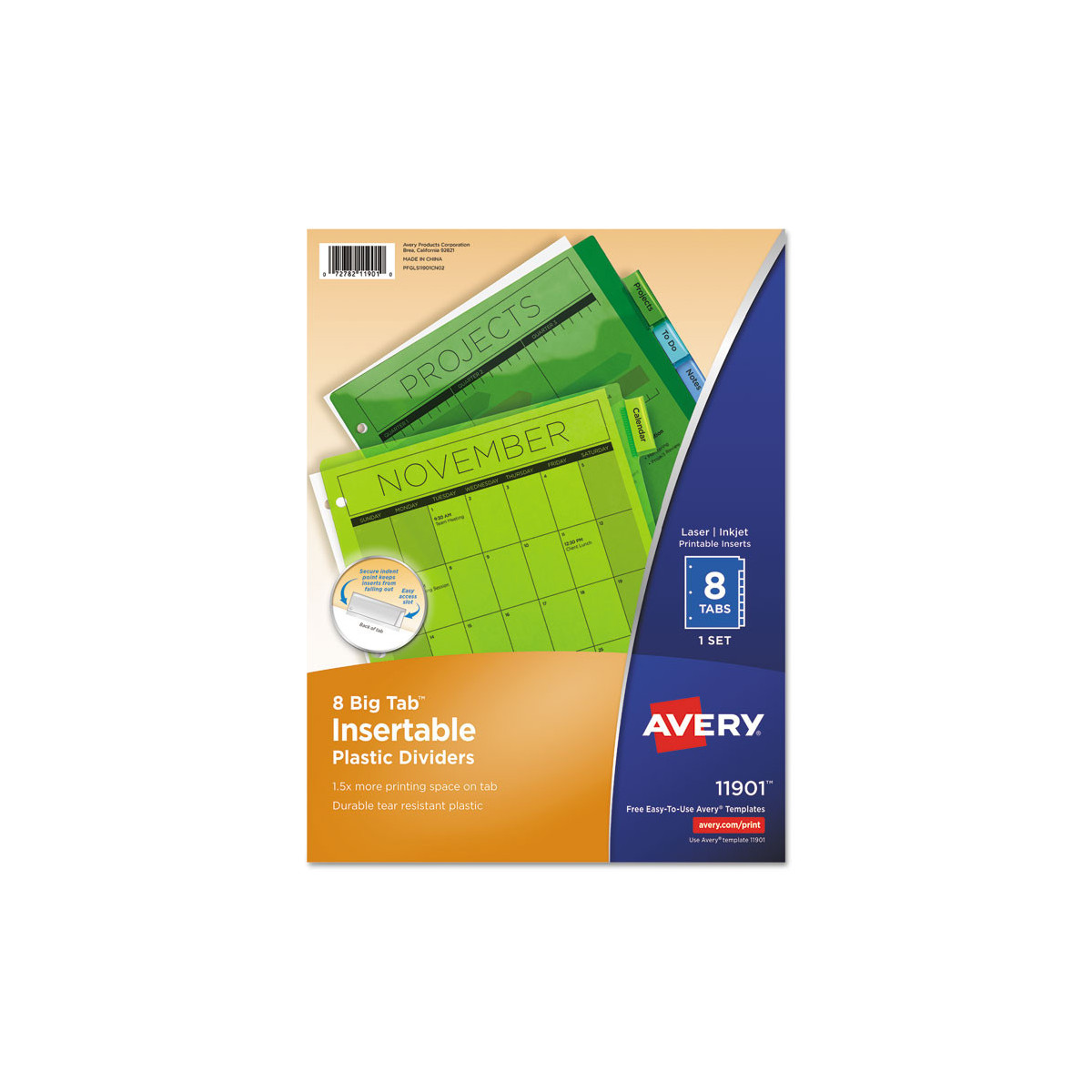 Sometimes good things do come in big packages. Big Tab™ Insertable Plastic Dividers offer extra convenience for your binder or notebook. The larger style insertable tabs accommodate inserts that you can print with sizeable fonts or more lines of text than on a typical insert for even more eye-catching power. Use free templates from Avery Design & Print to create professional-looking tabs. An easy-access notch at the top of the tab lets you slide inserts in and out with ease, while a secure indent point at the base of the tab keeps your insert from falling out. Translucent plastic offers a durable solution, so you can enjoy long-lasting organization of all your big ideas. Handwrite or print inserts on laser and inkjet printers.