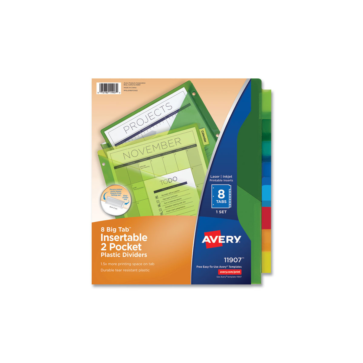 Strong organization and storage capabilities are yours with the help of these Big Tab Two-Pocket Insertable Plastic Dividers. Each divider features double plastic pockets, one on each side of the divider, to provide extra storage space for your important papers. The Big Tab design allows you to use larger fonts or more lines of text than on typical inserts for easier reading or more detailed labeling. Use a free template from Avery Design & Print to customize tabs titles onto the included label sheets using your computer and printer. The tabs' unique design keeps inserts from falling out, so your dividers stay securely labeled. Constructed with durable plastic, these dividers offer lasting organization in a big way. Handwrite or print inserts on laser and inkjet printers.
