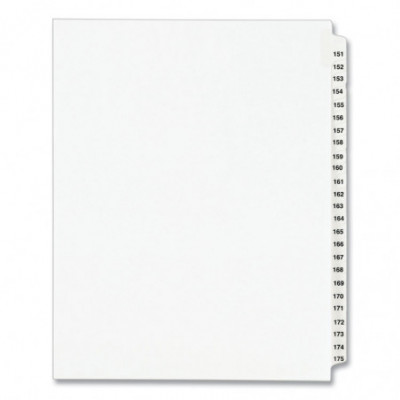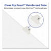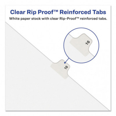 Use these dividers to organize index briefs, legal exhibits, mortgage documentation files and more. The crisp and clean white paper stock dividers give files a professional appearance. The durable Rip Proof™ reinforced tabs are preprinted on both sides so information can be located easily. The unpunched binding edges mean these indexes can fit practically any binding system.