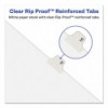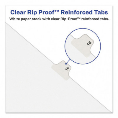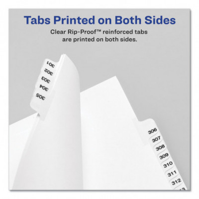 Use these dividers to organize index briefs, legal exhibits, mortgage documentation files and more. The crisp and clean white paper stock dividers give files a professional appearance. The durable Rip Proof™ reinforced tabs are preprinted on both sides so information can be located easily. The unpunched binding edges mean these indexes can fit practically any binding system.