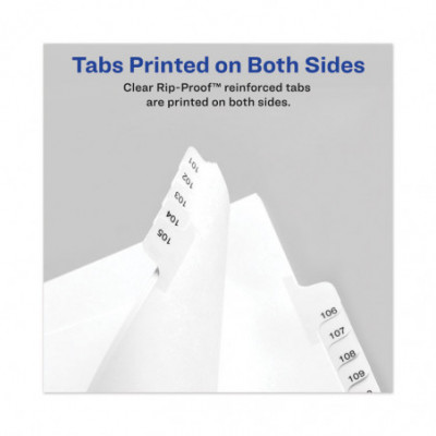 Rip Proof™ reinforced tabs printed on both sides with exhibit letter. Easy-to-read Helvetica bold type stands out. Unpunched for flexibility in binding.