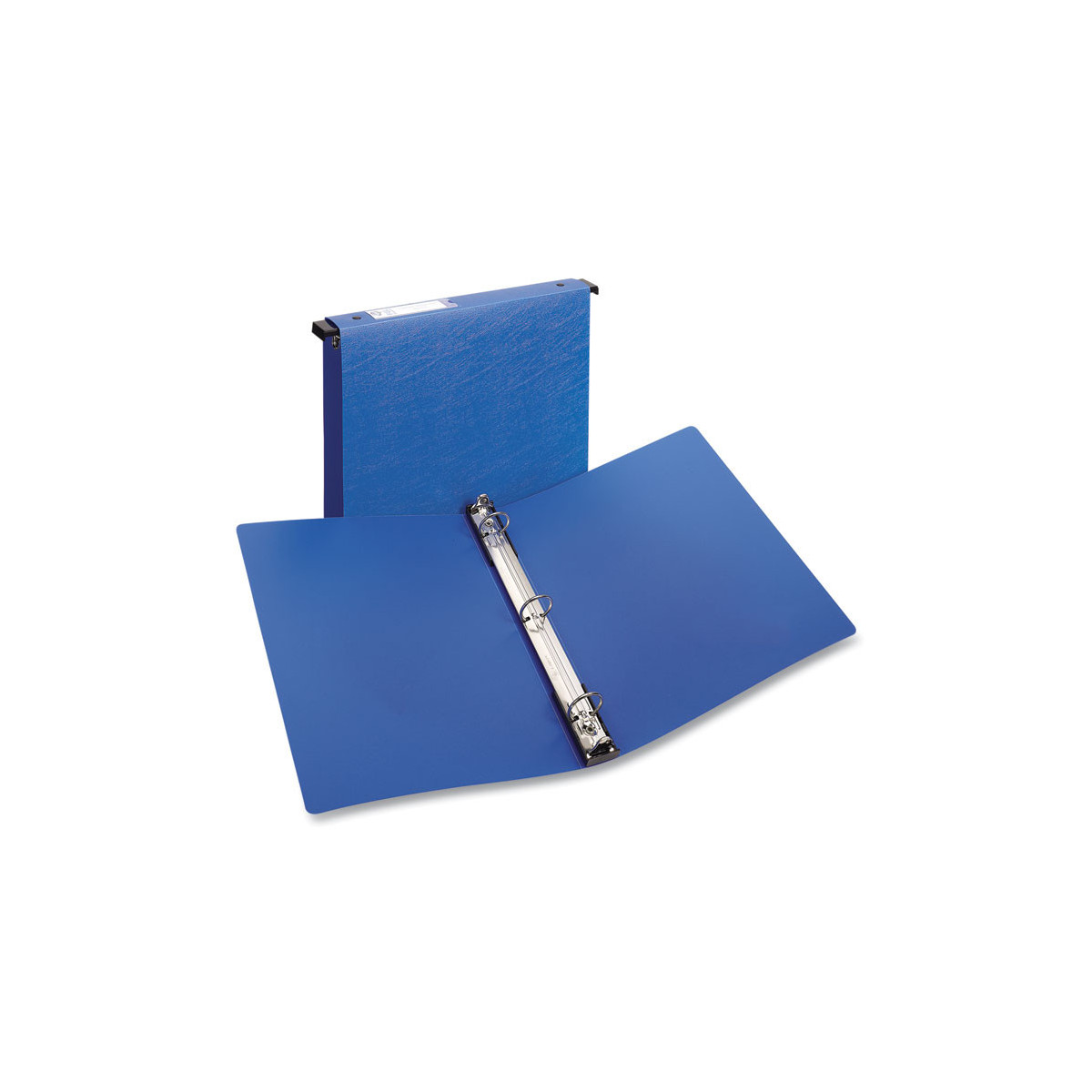 Storage binder with built-in "hangers" designed to hold the binder in standard hanging file systems. Label holder on spine helps easily identify contents. Sturdy, flexible, non-stick poly covers. Non-stick poly material prevents ink and toner transfer. Round ring. Holds 8.5" x 11" documents.