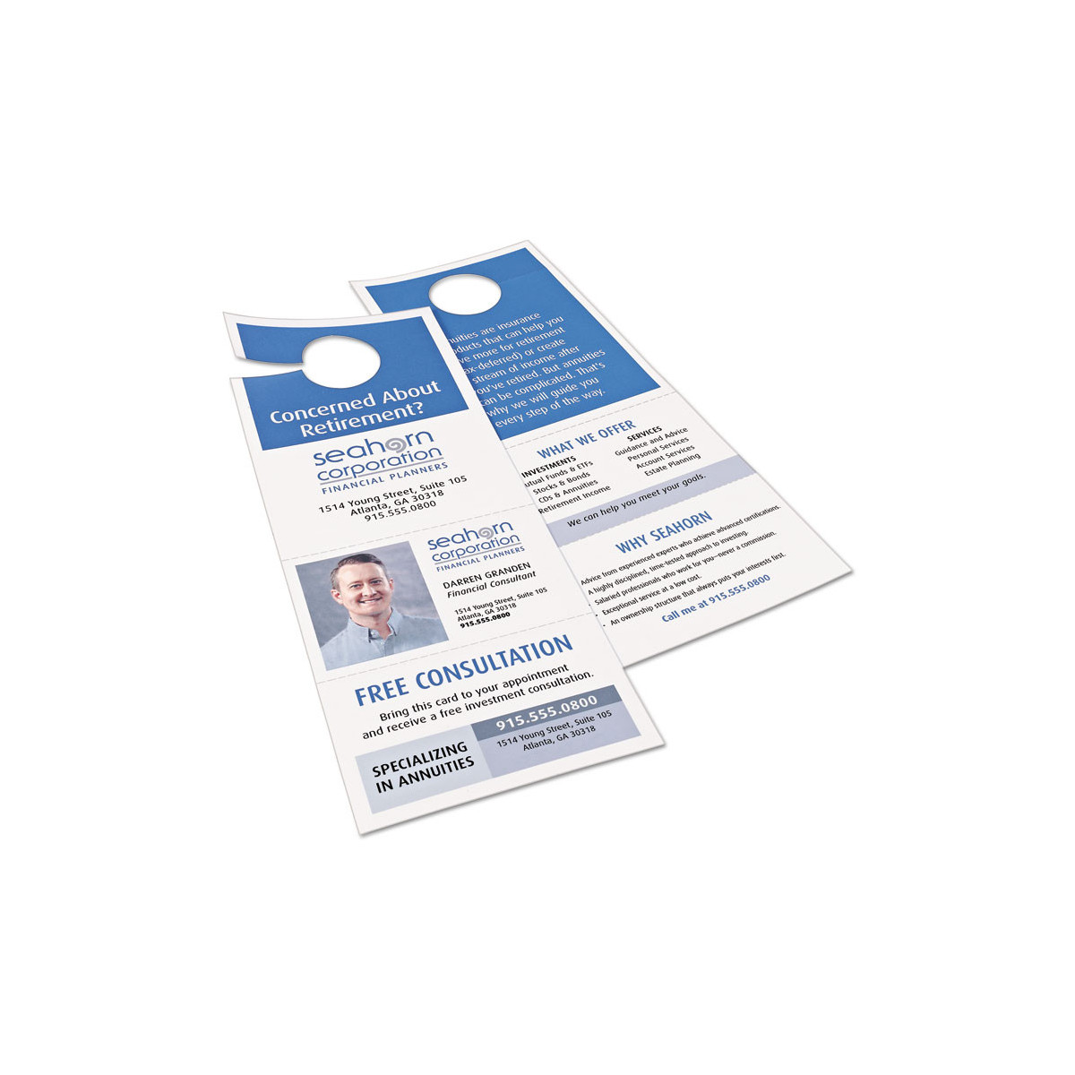 Design and print door hangers to attract customers. Contains two tear-off cards that snap apart with smooth, non-perforated edges. Cardstock is printable on both sides. Easy to customize with free templates and designs using Avery® Design & Print. 8.5" x 11" sheets for laser and inkjet printers.