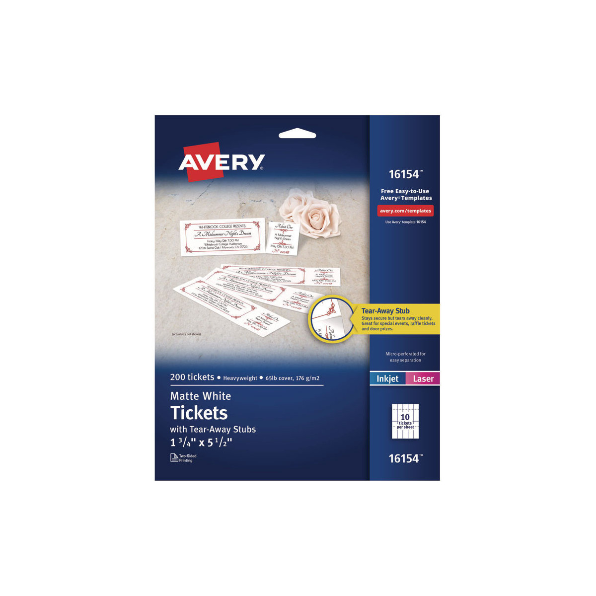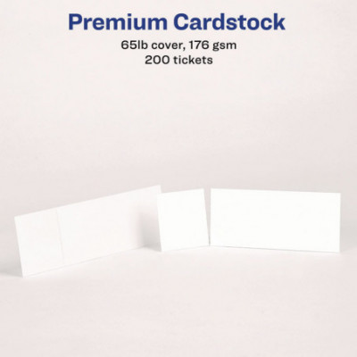 Create a buzz for your event or fundraiser by designing professional looking tickets from your own computer. These customizable Tickets with Tear-Away Stubs are easy to print and offer a professional look, making them perfect for raffles, door prizes, dances, school and church events or fundraisers. You can personalize your tickets on one or both sides at Avery® Design & Print with complimentary designs and templates, which include automatic ticket numbering options for easy record keeping. The tickets separate cleanly after printing with no scissors required. Strong perforations on the stubs ensure they will stay put until your event. Now you can create personalized tickets that will be the talk of any event. For laser and inkjet printers. Ten tickets per sheet. Card size is 1.75" x 5.5".