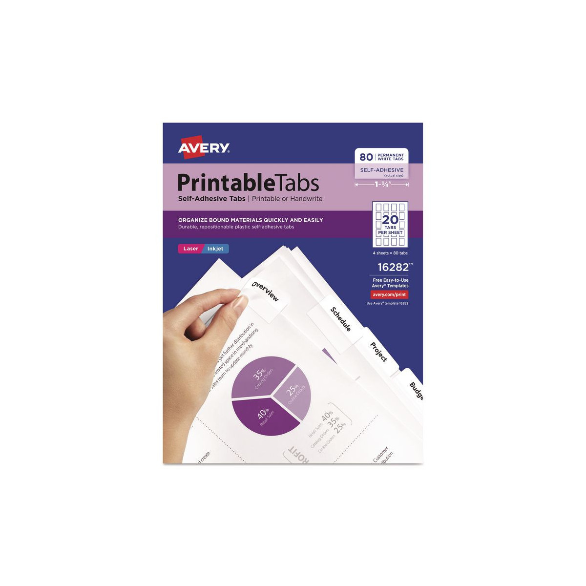 Durable plastic tabs attach to the edge of any size page. Ideal for use with bound reports, personal organizers, reference manuals, catalogs or more. Special adhesive allows tabs to be repositioned when applied but become permanent over time for added security. Print directly on front and back of tabs. Easy to customize with free templates from Avery Design & Print. Handwrite or print tabs using laser and inkjet printers.