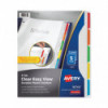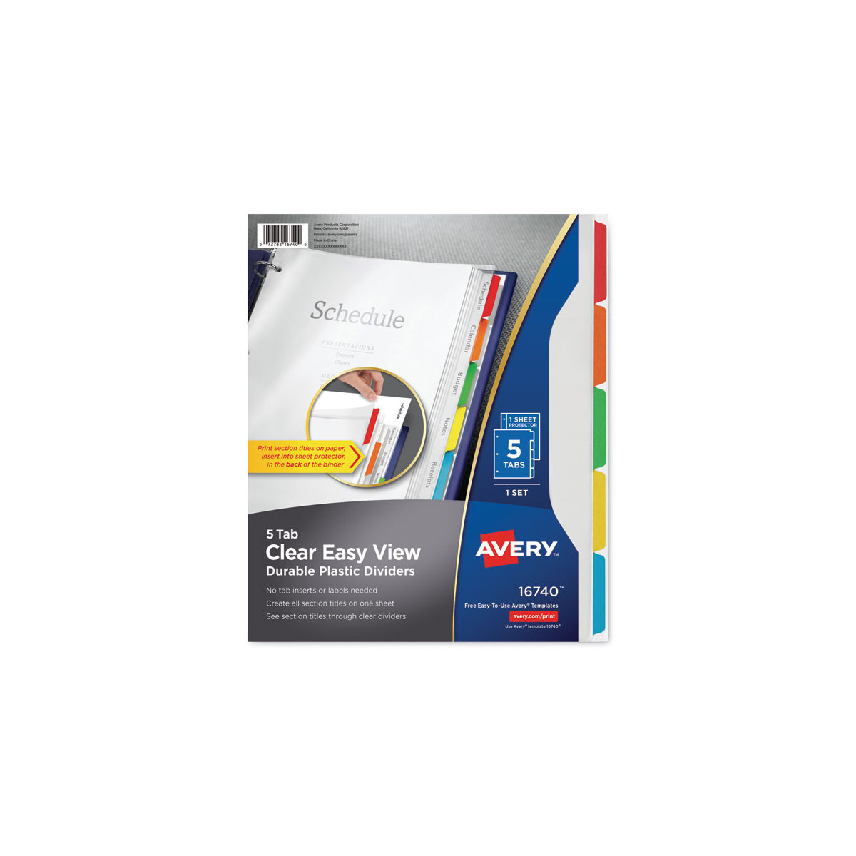 These clear, easy view durable plastic dividers let you easily create or update your section titles with no tab inserts or labels needed. The 3-ring binder dividers and sheet protector work together to provide a clean, professional look and the flexibility to easily make changes or reuse your page dividers again and again. Just print your section titles on a plain sheet of paper and insert the sheet into the included sheet protector. Place the sheet protector in the back of your binder and the clear plastic dividers allow you to see your section titles below. Our free templates on the Avery site let you easily customize the section titles for your divider tabs in minutes. When you need to make a change or reuse your dividers, simply update the template and print a replacement sheet. The tabs are also writeable with a pen, pencil or marker, while Avery Dry Erase Marker ink can erase off the divider and sheet protector after up to one month. The extra durable, tear-resistant plastic wipes clean with most non-abrasive household cleaners.