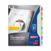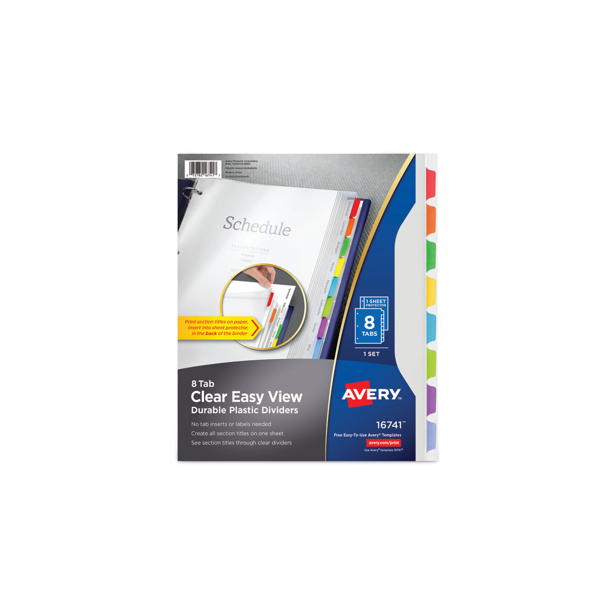 These clear, easy view durable plastic dividers let you easily create or update your section titles with no tab inserts or labels needed. The 3-ring binder dividers and sheet protector work together to provide a clean, professional look and the flexibility to easily make changes or reuse your page dividers again and again. Just print your section titles on a plain sheet of paper and insert the sheet into the included sheet protector. Place the sheet protector in the back of your binder and the clear plastic dividers allow you to see your section titles below. Our free templates on the Avery site let you easily customize the section titles for your divider tabs in minutes. When you need to make a change or reuse your dividers, simply update the template and print a replacement sheet. The tabs are also writeable with a pen, pencil or marker, while Avery Dry Erase Marker ink can erase off the divider and sheet protector after up to one month. The extra durable, tear-resistant plastic wipes clean with most non-abrasive household cleaners.