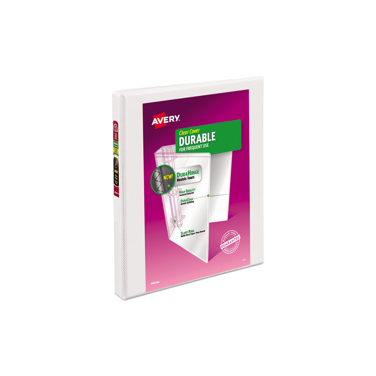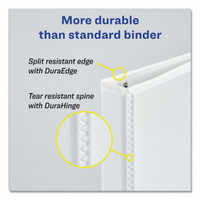 Keep lecture notes, procedures and homework assignments organized with an Avery® Durable View Binder. The durable construction is ideal for frequent referencing. The DuraHinge® design is stronger, lasts longer and resists tearing, and the DuraEdge® feature makes the sides and top more pliable, providing greater split resistance. Deeply textured film offers a smoother finish and features a linen pattern for a high-quality look and feel. Two interior pockets help you organize and secure loose papers, and the slant rings hold a higher page capacity compared to same size round rings. Use the clear overlays to label and/or decorate the covers and spine. Customize your binder more easily and more creatively with free templates and designs at Avery® Design & Print Online.