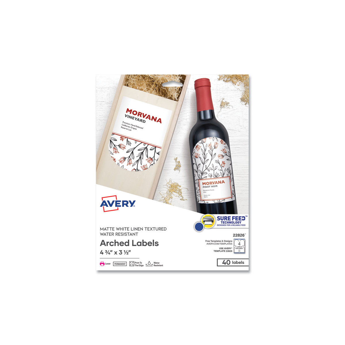 Give an elegant look to all your products and marketing materials with these water-resistant textured labels. Specially designed for the wine industry, our labels will hold their strength when wet, and colors won't run, making them perfect for labeling chilled products. They're ideal for glass bottles and jars, plastic, metal and paper. The upscale look and arched-shape will also add a touch of class to your branded products, brochures and other business items. Use the free templates and designs from Avery® Design & Print to personalize your labels for your unique marketing strategy. The Print-to-the-Edge feature lets you apply bright colors and sharp clear text all the way to the edge of the label to vividly showcase your logo or promotion. Customizable marketing solutions are just a few clicks away with these versatile labels.