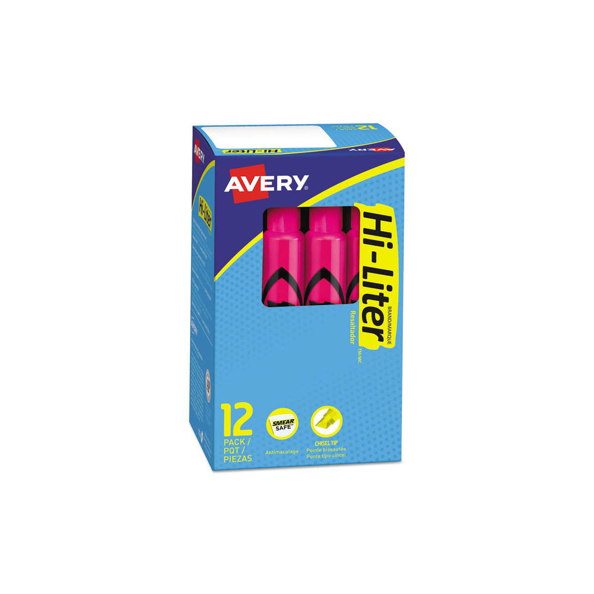 Study research materials, prepare documents or call attention to important information with Avery® HI-LITER Desk-Style Highlighters. Smear Safe, quick-drying ink provides reliable smear protection across most pen, marker and inkjet inks. Durable, fray-proof chisel tip accommodates both highlighting and underlining, while ensuring smooth performance. Nontoxic, low-odor ink is ideal for classrooms, offices and the home.