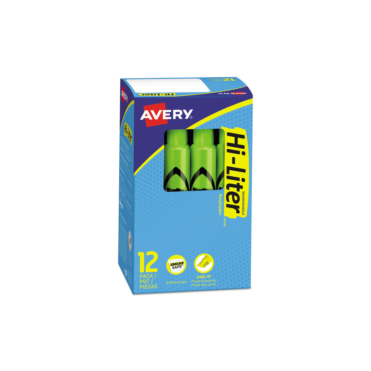 Study research materials, prepare documents or call attention to important information with Avery® HI-LITER Desk-Style Highlighters. Smear Safe, quick-drying ink provides reliable smear protection across most pen, marker and inkjet inks. Durable, fray-proof chisel tip accommodates both highlighting and underlining, while ensuring smooth performance. Nontoxic, low-odor ink is ideal for classrooms, offices and the home.