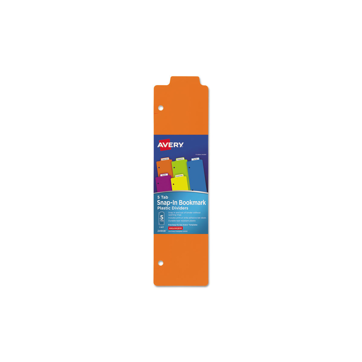 Use bookmark-style plastic dividers for dividing, sub-dividing, or bookmarking a spot. Three-hole punched. Snap in and out of binders easily without opening rings. Set of five per pack. Handwrite on tabs or print white tab labels with free templates and designs at Avery Design & Print.