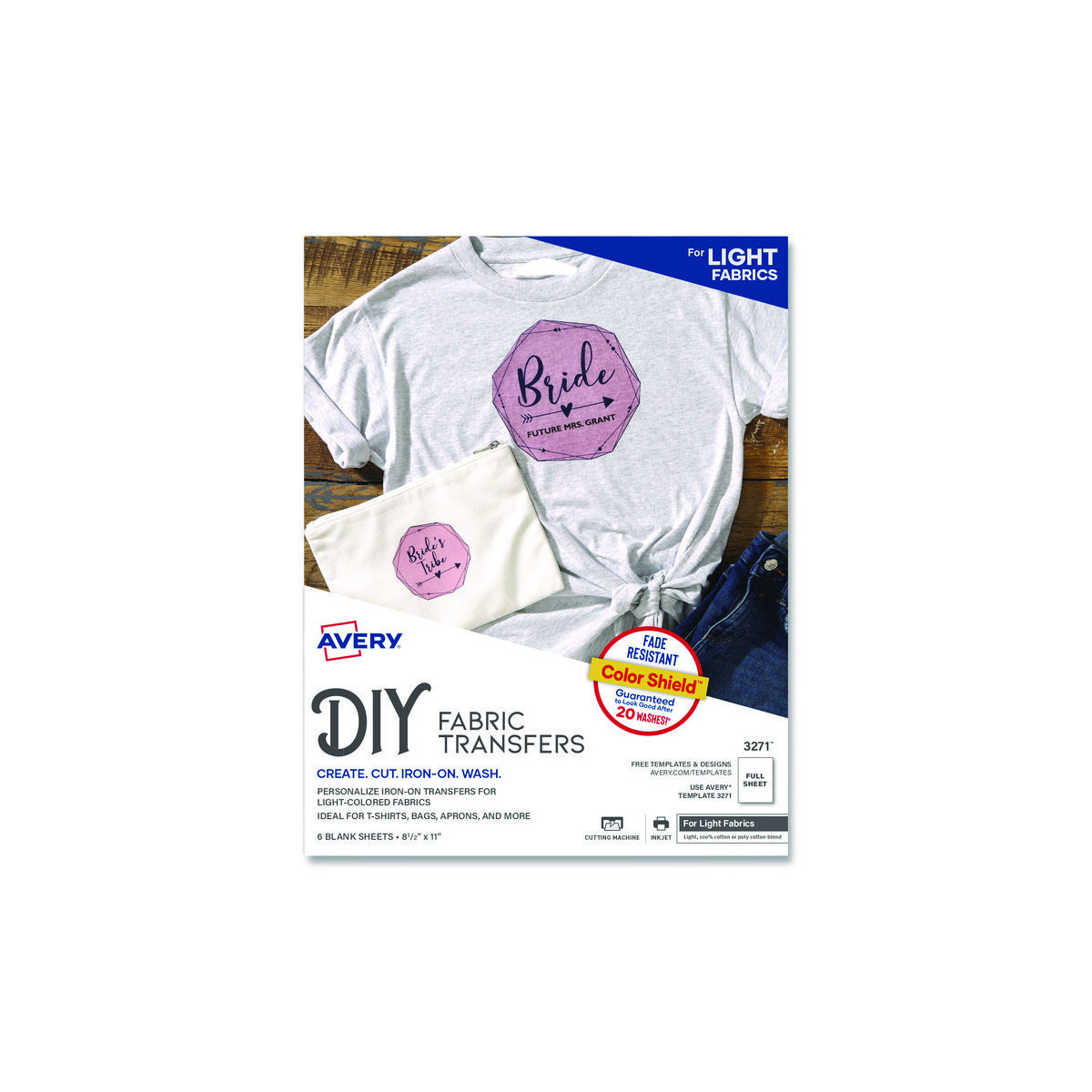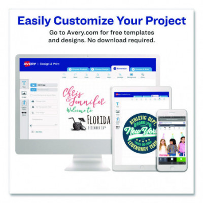 Design and print fabric transfers. Ideal for t-shirts, bags, promotional items and more. No cracking and color lasts longer. For use on 100% cotton or cotton poly blend fabrics. Easy to customize with complimentary designs and templates from Avery® Design & Print. For inkjet printers.