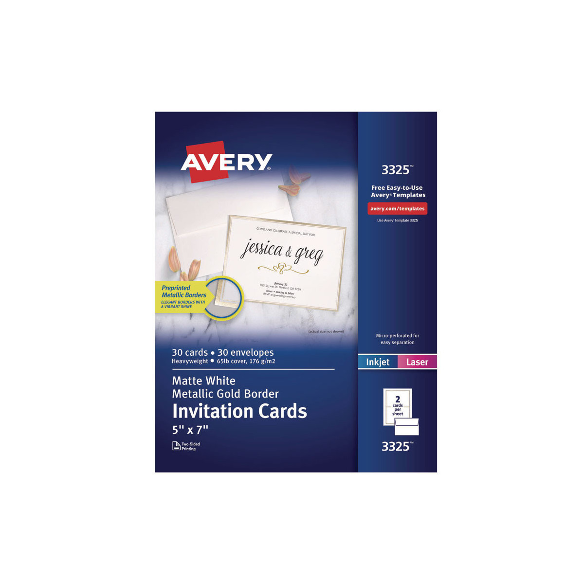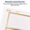 Create elegant and memorable personalized invitations with metallic gold borders. Easily make double-sided designs. Heavyweight cardstock is pre-scored for easy folding and separation. Envelopes included. Printable on both sides. Easy to customize with free templates and designs at avery.com/templates. 8.5" x 11" sheets for laser and inkjet printers.