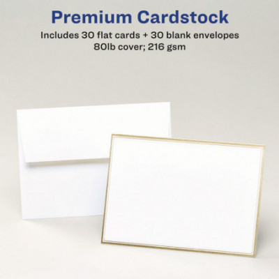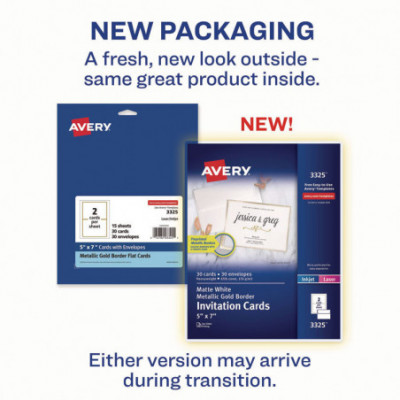 Remarkably reflective and elegant, Avery matte white invitation cards with metallic gold borders bring a strikingly radiant shine to any event or project. Each card is pre-printed with a brilliant gold foil-like border that is guaranteed to capture people's attention. Using 80-lb cardstock, each durable card has a premium feel. Simply fold and tear away each card on the sheet using the precise perforations on the edge of the cards which will leave behind a smooth edge. Create amazing double-sided designs to make DIY wedding invitations, holiday cards, menu cards, wedding programs, recipe cards, party invitations and more using the free design software and templates at avery.com/templates. Invitation cards come with blank white envelopes. Cards are compatible with both laser printers and inkjet printers. Please Note: The envelopes are not printable.